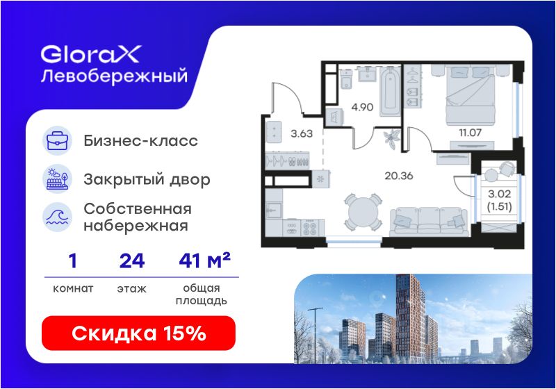 Продается 1-комн. квартира на 24-м этаже в строящемся проекте бизнес-класса GloraX Левобережный. Общая площадь лота составляет 41,47 кв. м, из которых 11,07 кв. м отведено под жилую и 20,36 кв. м под кухонную зону. Номер квартиры - 420.