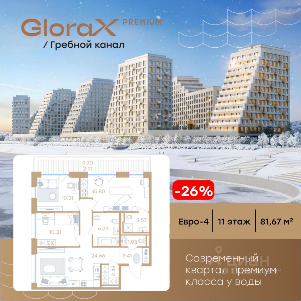 Продается 3-комн. квартира на 11-м этаже в строящемся проекте премиум-класса GloraX Premium Гребной канал. Общая площадь лота составляет 81,67 кв. м, из которых 36,42 кв. м отведено под жилую и 24,66 кв. м под кухонную зону. Номер квартиры - 267.