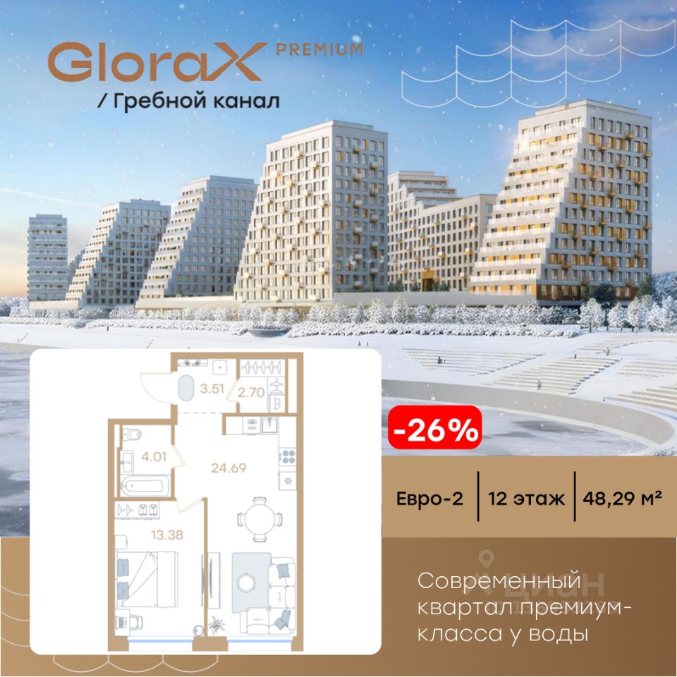Продается 1-комн. квартира на 12-м этаже в строящемся проекте премиум-класса GloraX Premium Гребной канал. Общая площадь лота составляет 48,29 кв. м, из которых 13,38 кв. м отведено под жилую и 24,69 кв. м под кухонную зону. Номер квартиры - 111.