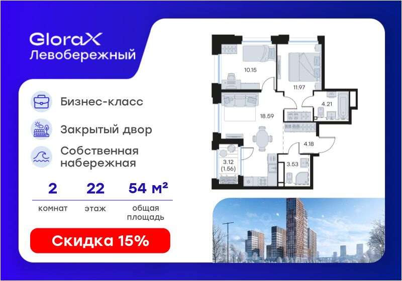 Продается 2-комн. квартира на 22-м этаже в строящемся проекте бизнес-класса GloraX Левобережный. Общая площадь лота составляет 54,19 кв. м, из которых 22,12 кв. м отведено под жилую и 18,59 кв. м под кухонную зону. Номер квартиры - 389.