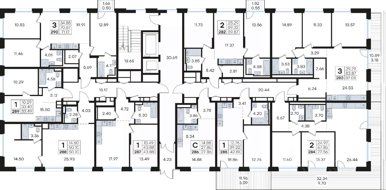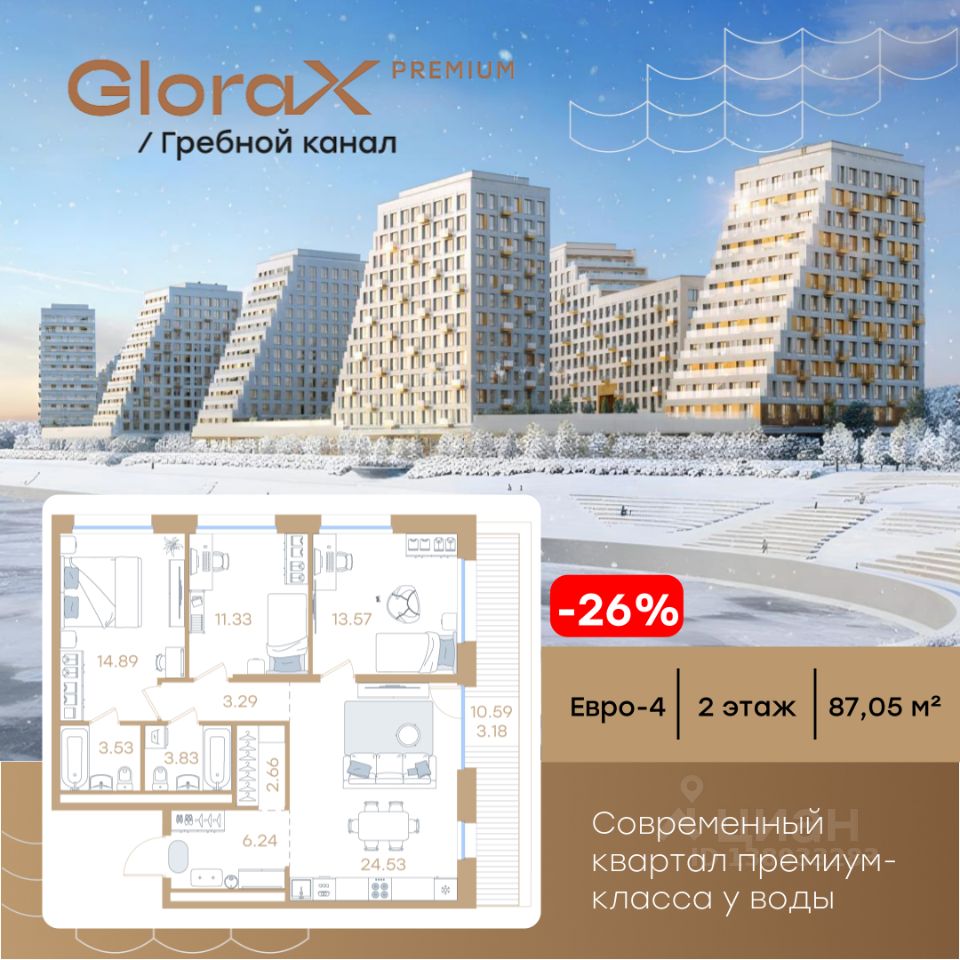 Продается 3-комн. квартира на 2-м этаже в строящемся проекте премиум-класса GloraX Premium Гребной канал. Общая площадь лота составляет 87,05 кв. м, из которых 39,79 кв. м отведено под жилую и 24,53 кв. м под кухонную зону. Номер квартиры - 283.