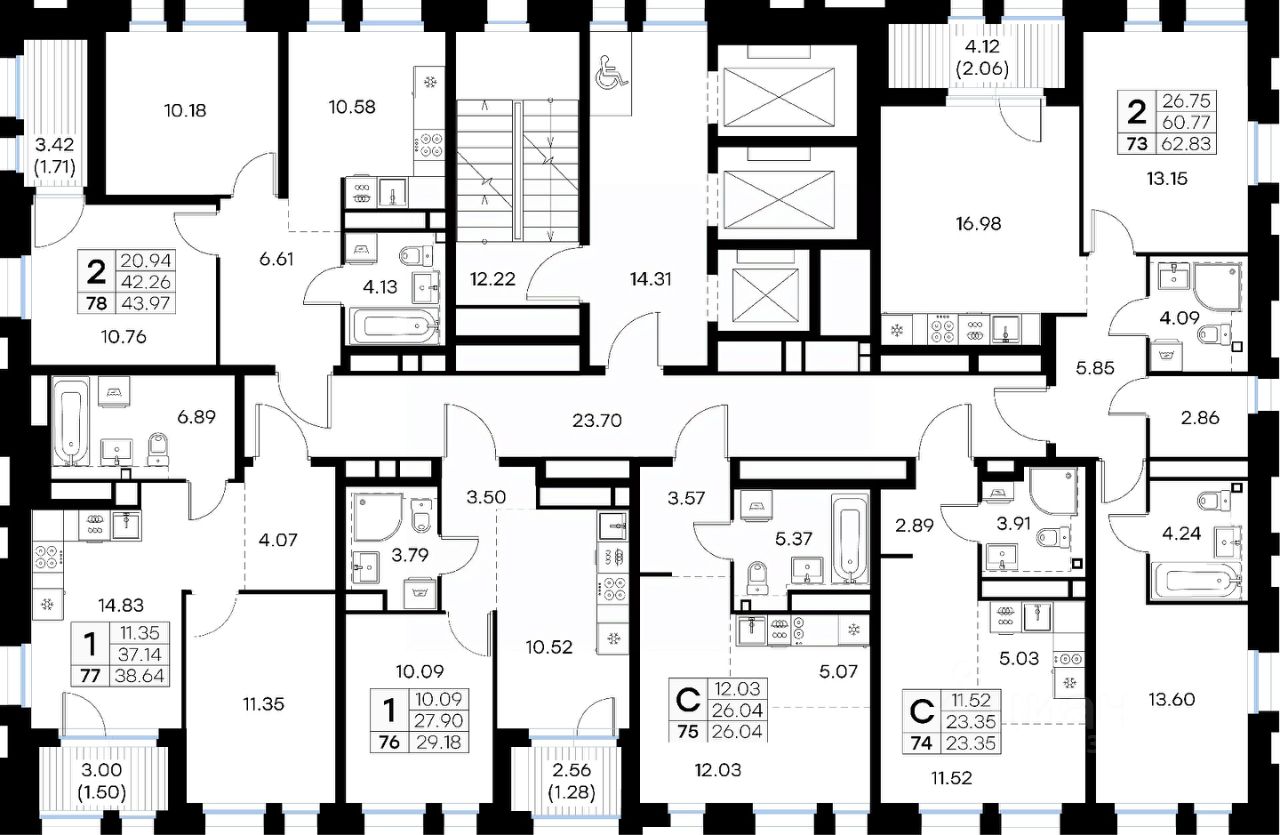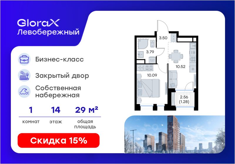 Продается 1-комн. квартира на 14-м этаже в строящемся проекте бизнес-класса GloraX Левобережный. Общая площадь лота составляет 29,18 кв. м, из которых 10,09 кв. м отведено под жилую и 10,52 кв. м под кухонную зону. Номер квартиры - 76.