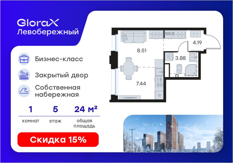 Продается квартира-студия на 5-м этаже в строящемся проекте бизнес-класса GloraX Левобережный. Общая площадь лота составляет 24,02 кв. м, из которых 8,51 кв. м отведено под жилую и 7,44 кв. м под кухонную зону. Номер квартиры - 194.