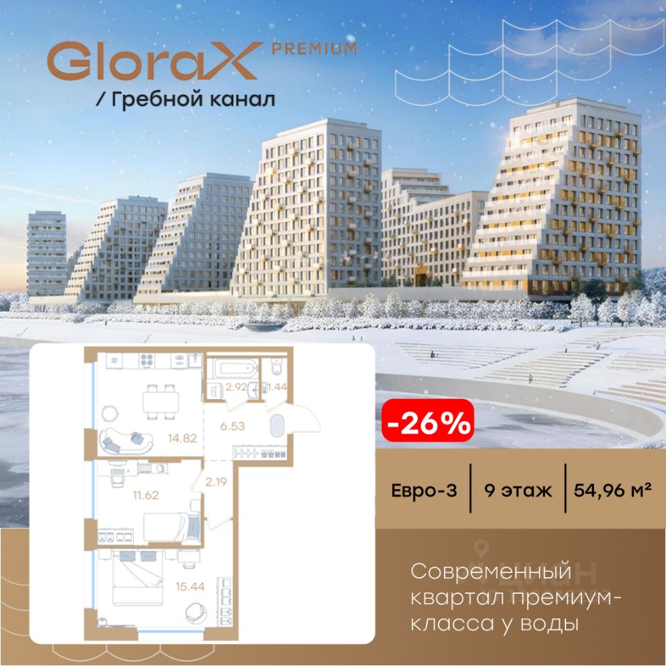 Продается 2-комн. квартира на 9-м этаже в строящемся проекте премиум-класса GloraX Premium Гребной канал. Общая площадь лота составляет 54,96 кв. м, из которых 27,06 кв. м отведено под жилую и 14,82 кв. м под кухонную зону. Номер квартиры - 522.