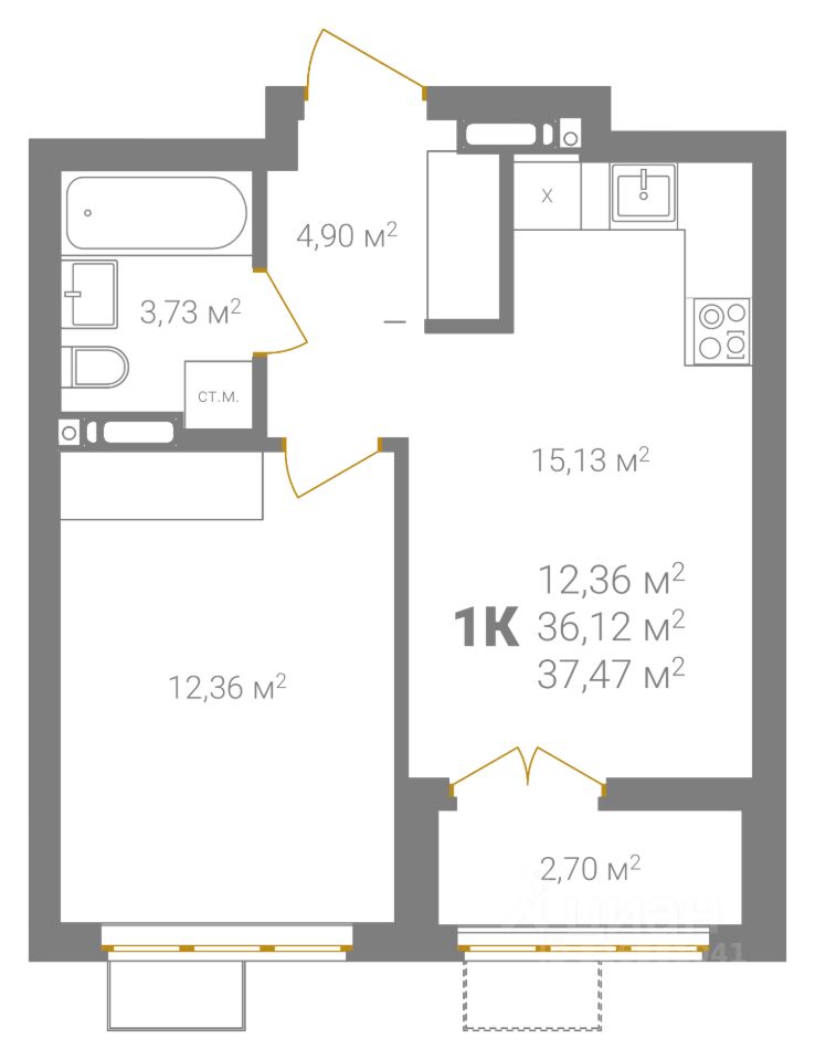 Общая площадь37,47 м2