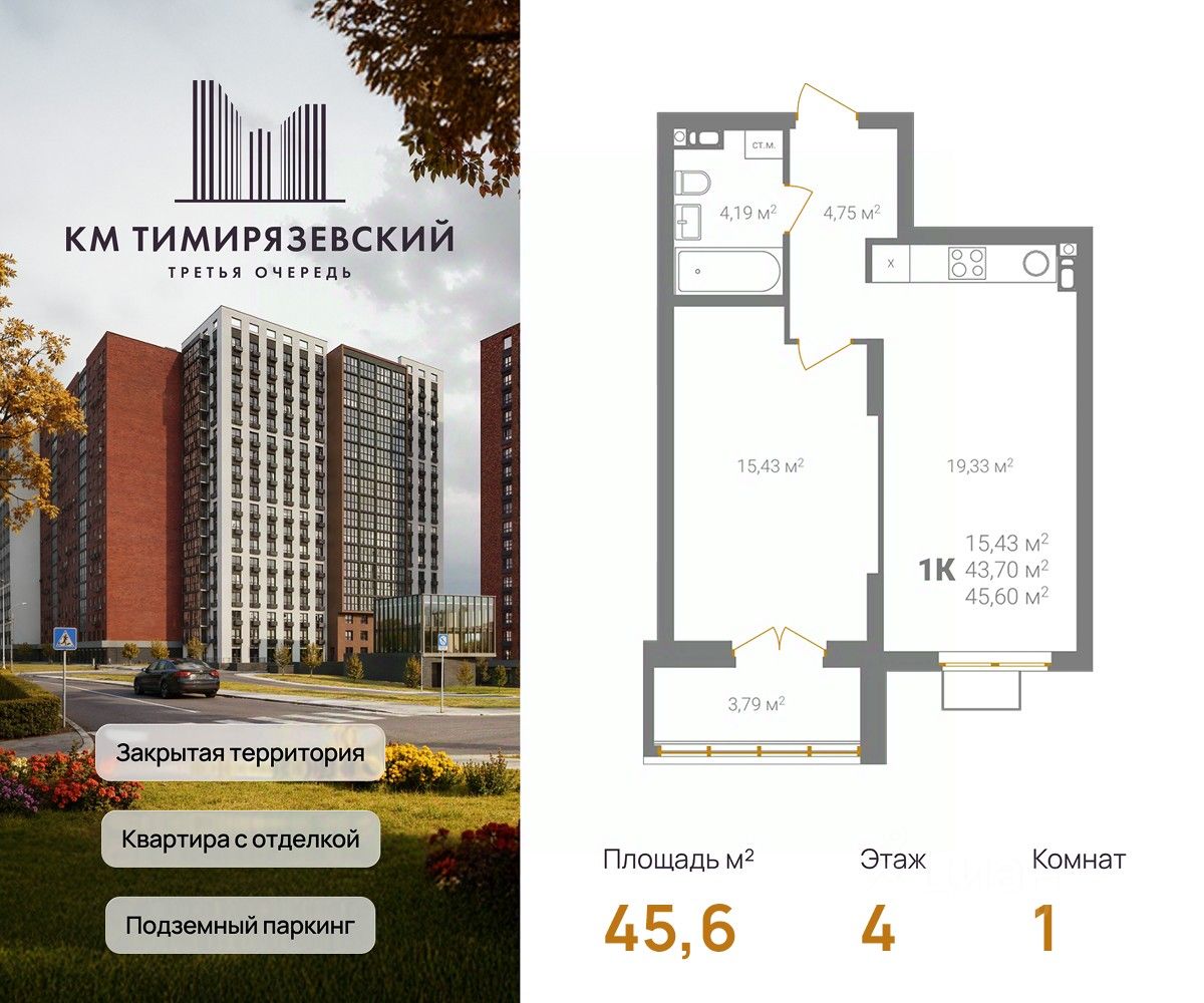 Фасады из керамического кирпича — надёжно и стильно Закрытый двор без машин — безопасность и уют Благоустройство продуманная территория для детей и взрослых Подземный паркинг — два уровня, лифт в жилую часть Коммерческие помещения на 1 этаже — магазины и сервисы рядом Все квартиры с готовой отделкой До 4 квартир в обособленном холле. КМ Тимирязевский. 3 очередь — ваш новый уровень комфорта.