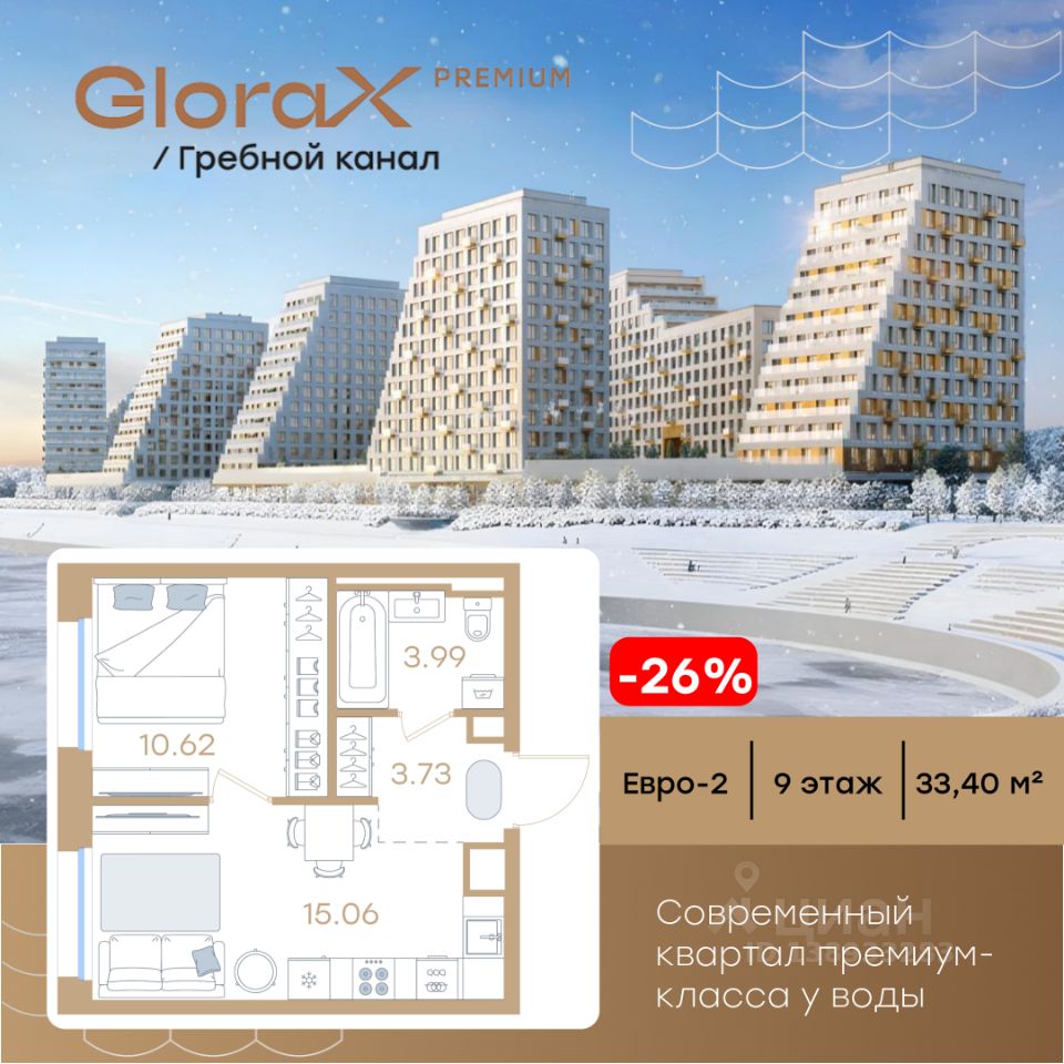 Продается 1-комн. квартира на 9-м этаже в строящемся проекте премиум-класса GloraX Premium Гребной канал. Общая площадь лота составляет 33,40 кв. м, из которых 10,62 кв. м отведено под жилую и 15,06 кв. м под кухонную зону. Номер квартиры - 84.