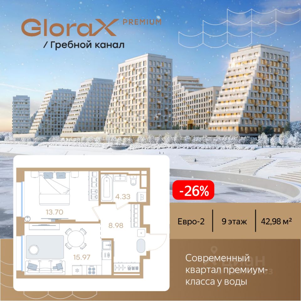 Продается 1-комн. квартира на 9-м этаже в строящемся проекте премиум-класса GloraX Premium Гребной канал. Общая площадь лота составляет 42,98 кв. м, из которых 13,70 кв. м отведено под жилую и 15,98 кв. м под кухонную зону. Номер квартиры - 524.