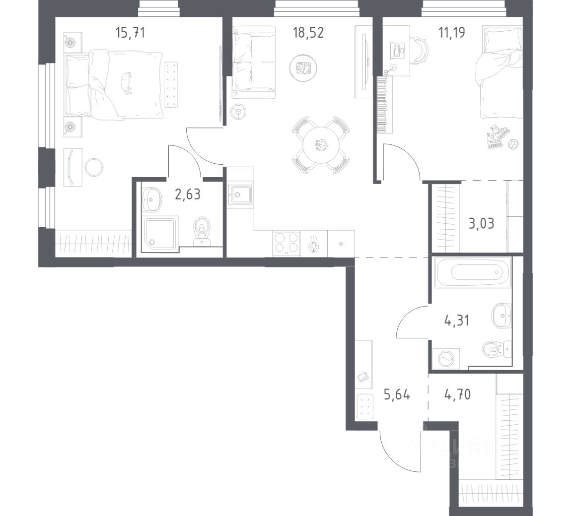 Квартиры с чистовой отделкой. В варианте с готовой отделкой мы поклеили обои под покраску, постелили полы в комнатах и санузлах, выполнили отделку стен. Установили сантехнику и межкомнатные двери, провели электрику. Это лучшее соотношение цены, качества и затраченного времени. Осталось только выбрать место для обеденного стола и удобного дивана. Доступность дополнительных опций уточняйте у застройщика.