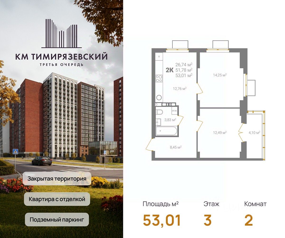Фасады из керамического кирпича — надёжно и стильно Закрытый двор без машин — безопасность и уют Благоустройство продуманная территория для детей и взрослых Подземный паркинг — два уровня, лифт в жилую часть Коммерческие помещения на 1 этаже — магазины и сервисы рядом Все квартиры с готовой отделкой До 4 квартир в обособленном холле. КМ Тимирязевский. 3 очередь — ваш новый уровень комфорта.