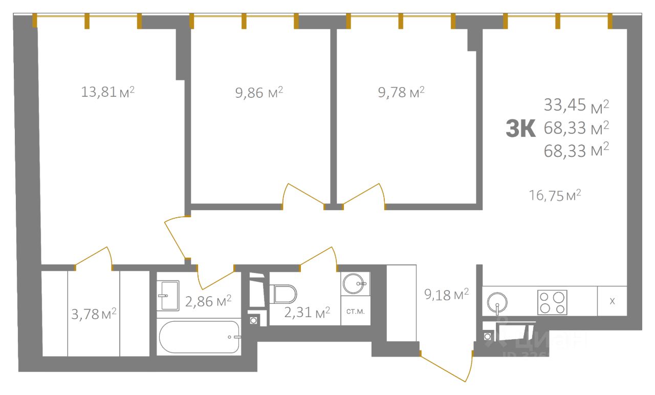 Общая площадь68,33 м2