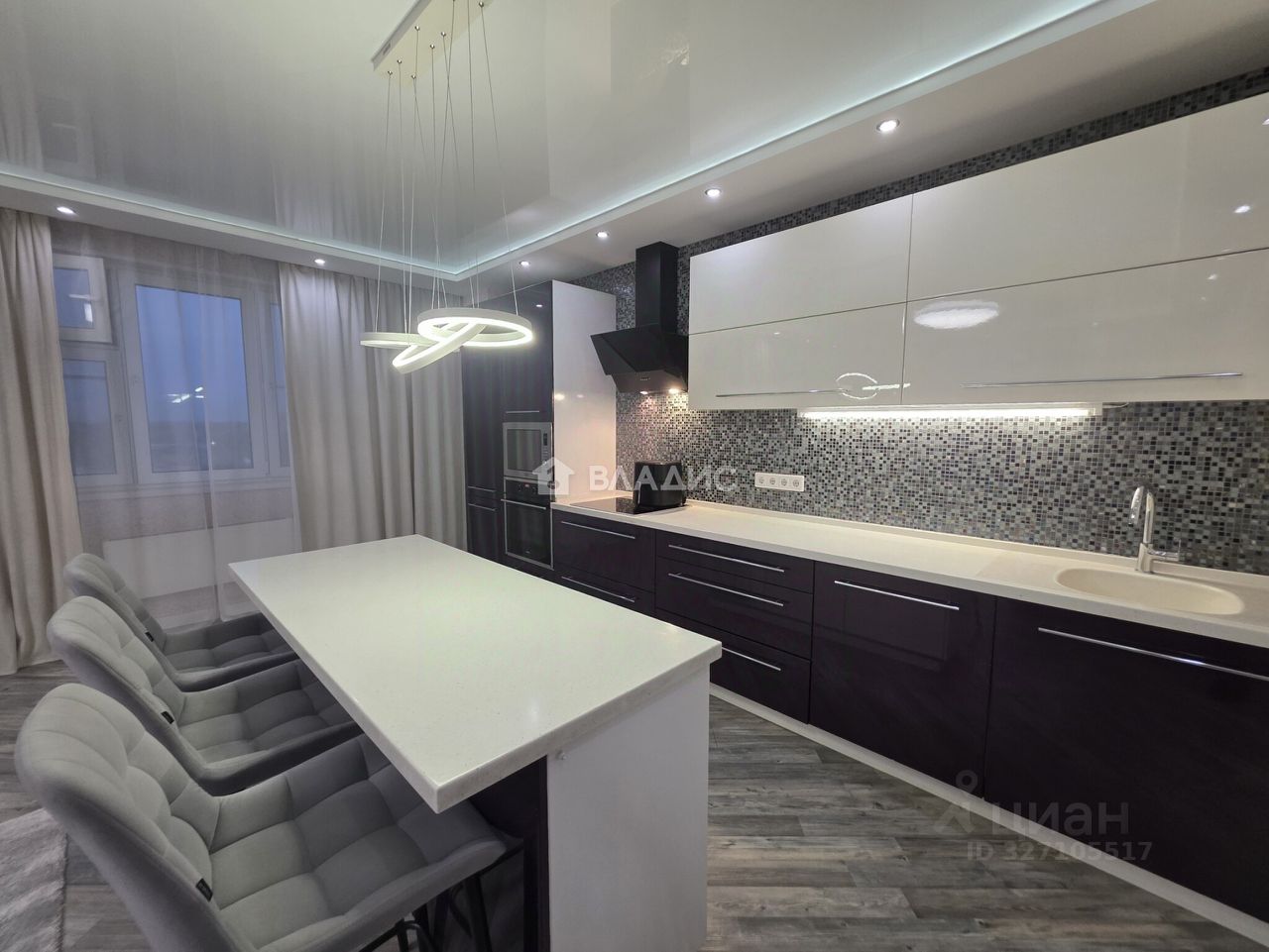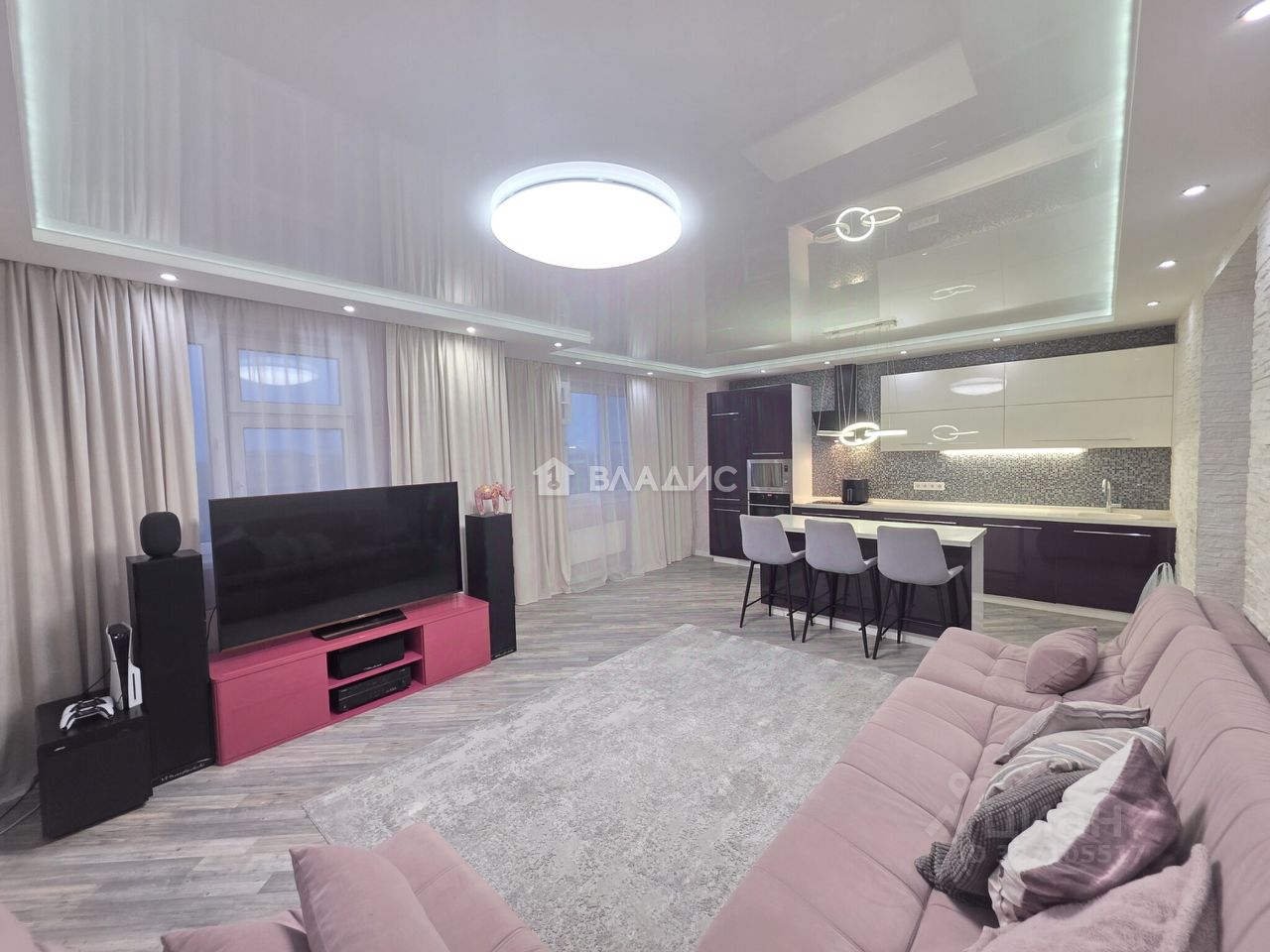 Огромная кухня-гостиная с акустической системой и большим модульным диваном станет любимым местом отдыха! Кухонный гарнитур и островок оснащены столешницами из акрила и всей необходимой встроенной техникой: Варочная панель, Духовка, Микроволновая печь и конечно же посудомоечная машина!
