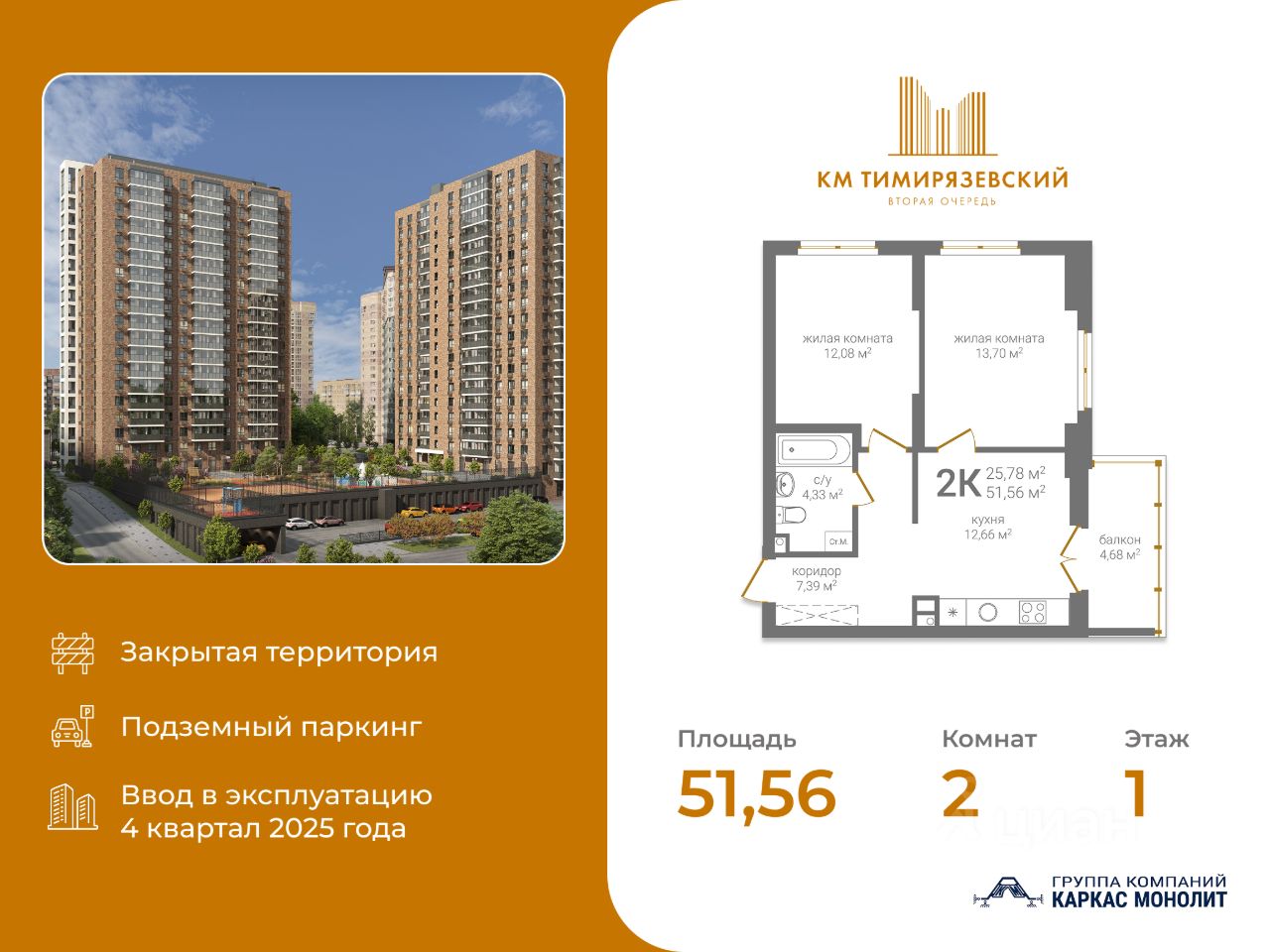 Общая площадь51,56 м2