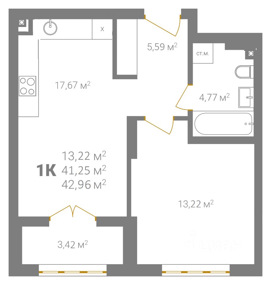 Общая площадь42,95 м2